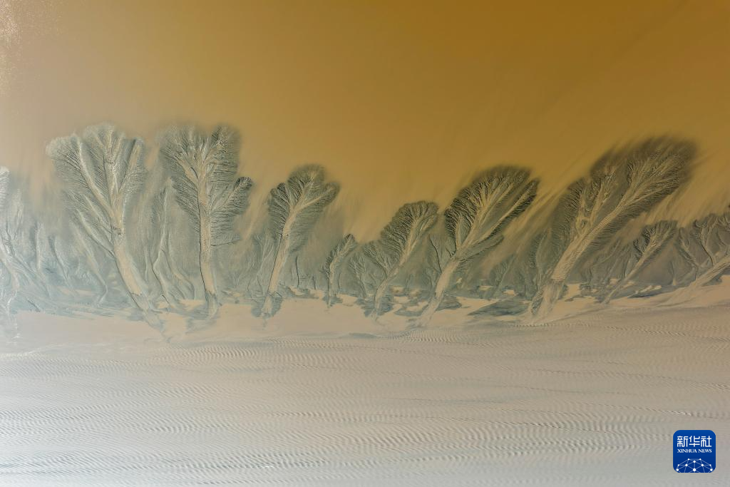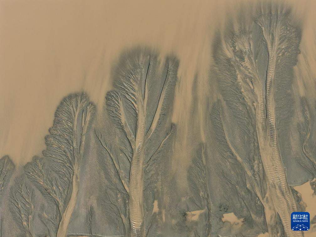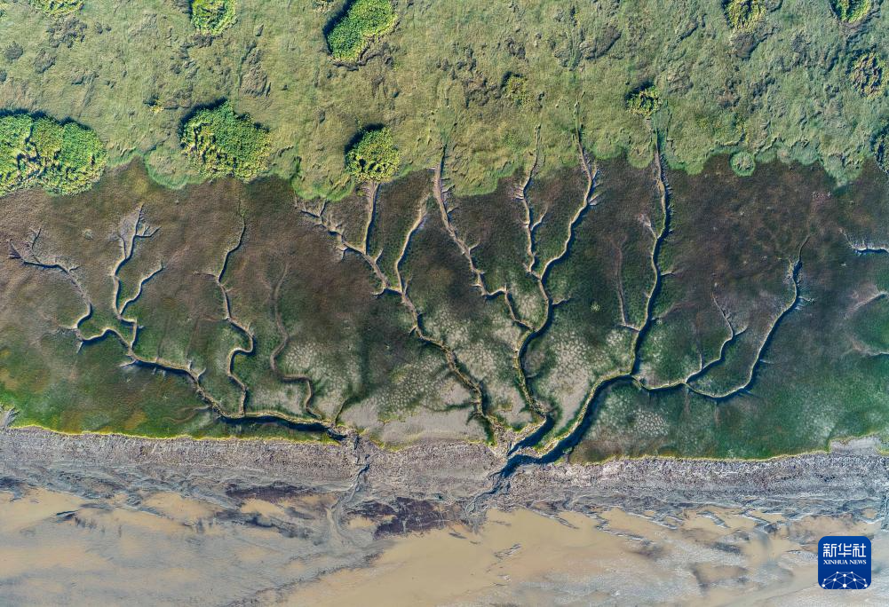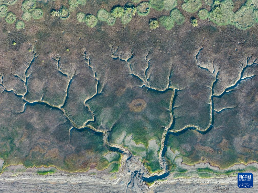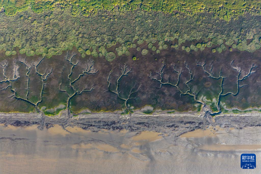 这是10月11日在浙江嘉兴海宁拍摄的钱塘江退潮后的“潮汐树”(无人机照片)。