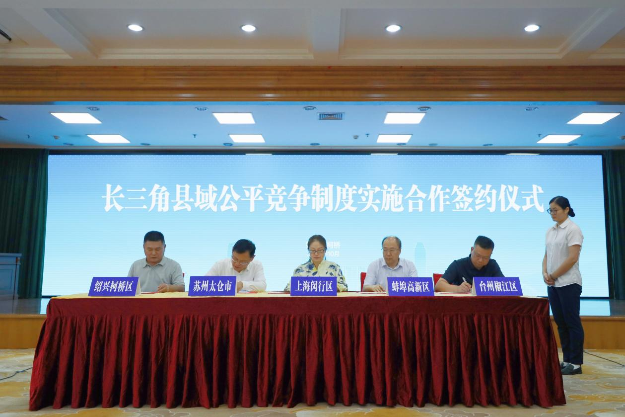 10月16日,长三角县域公平竞争制度实施合作研讨会在浙江省绍兴市柯桥区举行。来自上海市闵行区、江苏省太仓市、安徽省蚌埠高新技术产业开发区、浙江省台州市椒江区及绍兴市柯桥区的代表齐聚一堂,共同签署合作协议,标志着长三角公平竞争审查一体化合作从省、市级层面向县域纵深推进。
