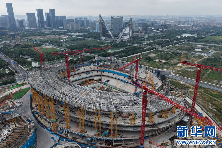 余杭国际体育中心项目总建筑面积约52万平方米,是浙江省“千项万亿”重大项目之一。该项目规划建设体育馆、游泳跳水馆和足球场,其中足球场为轮辐式双层索膜结构专用足球场,是浙江省首个超6万座专业足球场,建成后可承办国际足球顶级赛事。 目前,体育馆及游泳跳水馆工程主体结构全面封顶,已进入大规模钢结构施工阶段;足球场工程钢屋盖整体进度过半,主体结构已完成90%,项目建设正稳步推进。