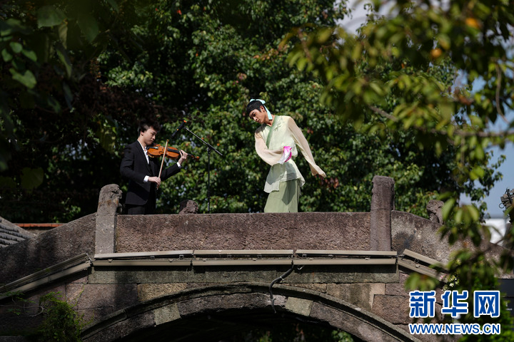10月24日,演员在新市古镇一座古桥上伴随小提琴声表演。
