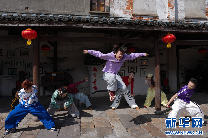 10月24日,街舞演员在新市古镇淘沙弄木色长廊表演《魅》。
