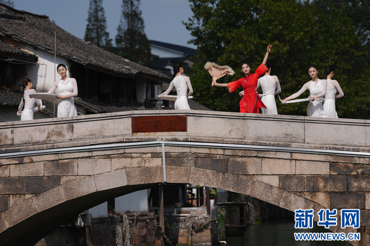 10月24日,浙江歌舞剧院演员在新市古镇表演舞蹈《富春》。
