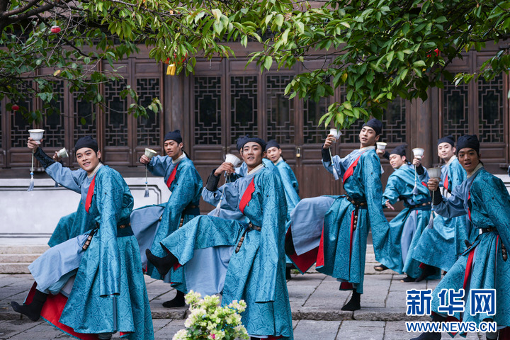10月24日,浙江歌舞剧院演员在新市古镇表演舞蹈《鹿鸣宴》。