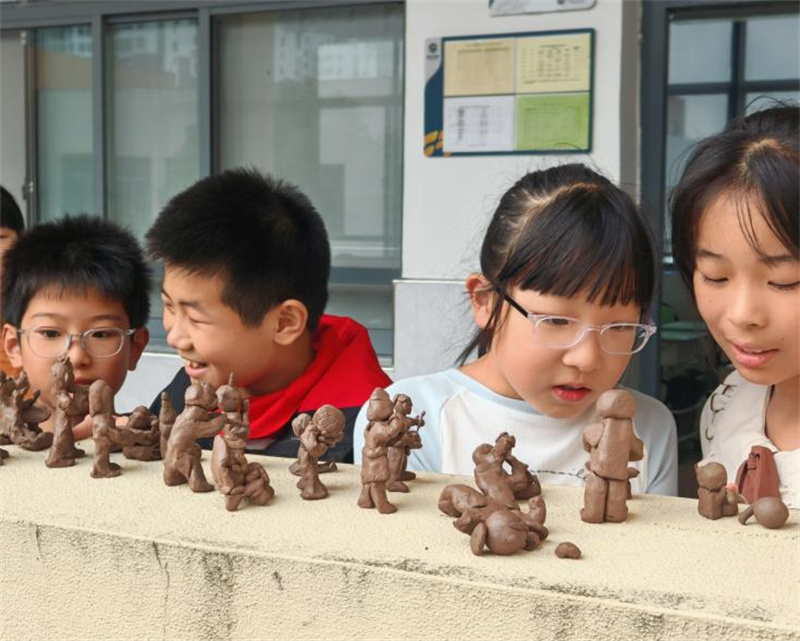 近日,走进湖州市湖师附小教育集团五年级所在的教学楼走廊,你会被一场别开生面的“课间小小艺术展”所吸引。这里没有昂贵的画框与雕塑,取而代之的是一群由学生亲手拈塑的陶泥“表演者”,他们吹拉弹唱,神态各异,组成了一个热闹非凡的“民间乐团”,为校园平添了一份浓郁的传统文化气息。