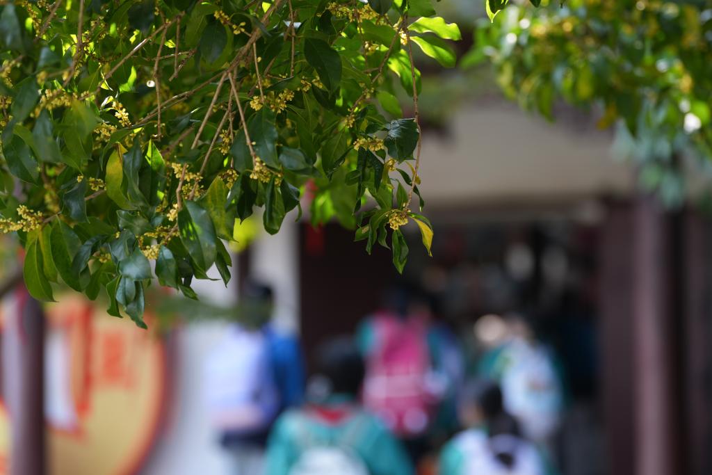 2025年10月29日,小学生在杭州西湖景区钱王祠内秋游,院内桂花香气四溢。新华社记者 黄宗治 摄