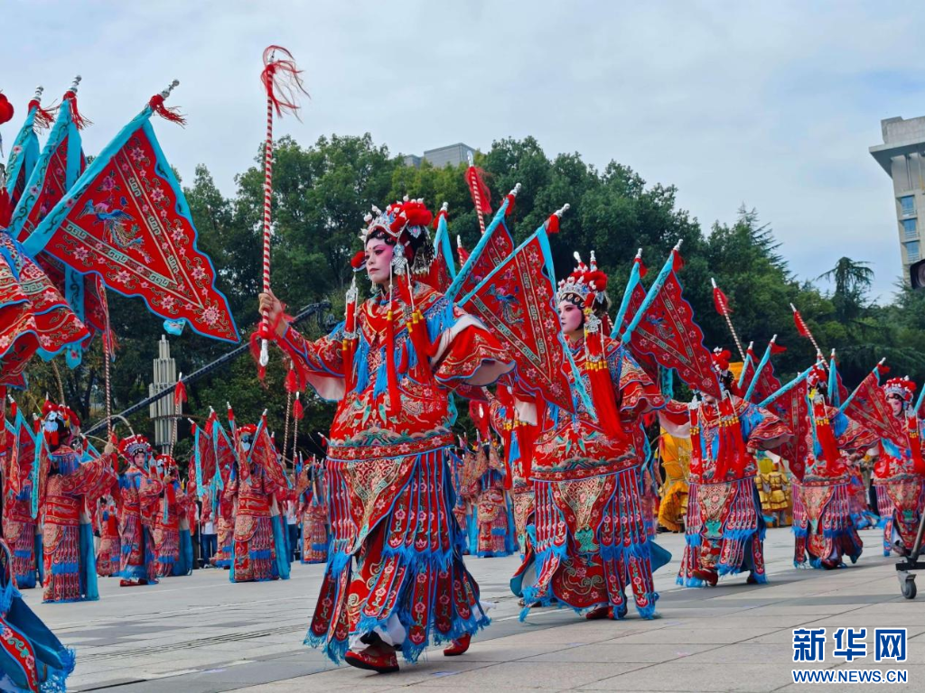 11月8日,在浙江省丽水市“非遗巡街”活动中,缙云方阵演员表演婺剧经典片段《穆桂英挂帅》,鲜艳服饰与铿锵唱腔展现传统戏曲魅力。新华网发 丽水市新闻传媒中心供图