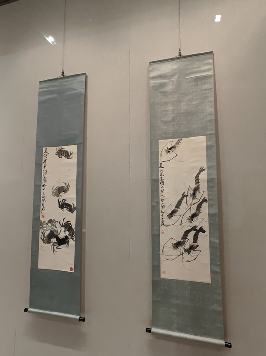展出的“齐白石墨虾图轴”“齐白石画蟹图轴”。新华社记者 冯源 摄