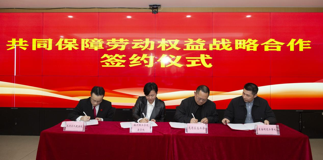 温州市龙湾区总工会、龙湾区人民法院、温州市龙湾区星海街道办事处与温州理工学院法学院等四家单位还共同签署了共同保障劳动权益战略合作协议,携手构建联动机制,为织密园区职工服务网络奠定坚实基础。