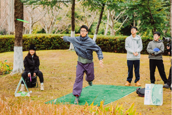 本次活动作为“活力越城”体育嘉年华之一,在赛事期间,园区内还开设了面向公众免费参与的“飞盘互动体验区”,设有飞盘九宫格、保龄球等趣味游戏。专门面向亲子家庭的“3洞迷你飞盘高尔夫”体验活动,由专业教练指导,让青少年家庭在自然中感受运动乐趣。此外,“飞趣无界市集”汇集了从专业飞盘装备、特色小吃、手工艺品到非遗文化展示等多个摊位,为现场增添了浓厚的运动休闲氛围和绍兴本地特色,将竞技性与大众娱乐性结合,推动体育与多产业深度融合。