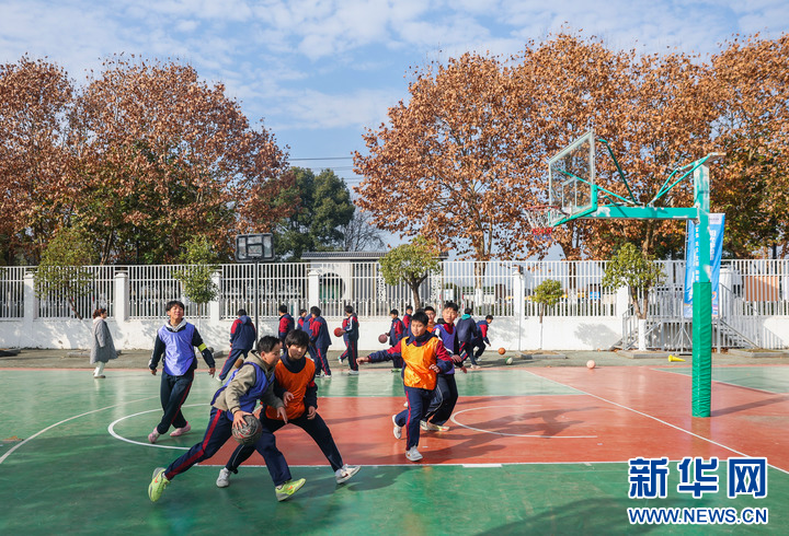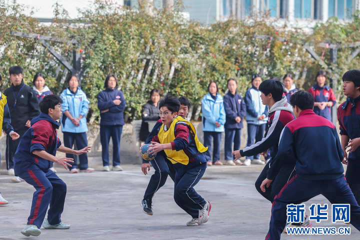 12月16日,轧村中学的学生们在阳光大课间活动中进行球类对抗训练。