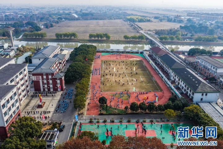 12月16日,轧村中学的学生们在参加阳光大课间活动(无人机照片)。