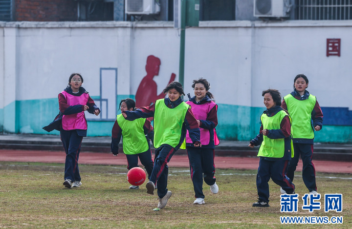 12月16日,轧村中学的学生们在阳光大课间活动中参加足球游戏。