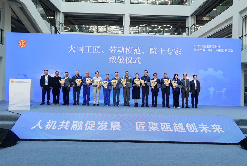 在2025大国工匠温州行暨温州第二届职工科技创新活动现场,举行大国工匠、劳动模范、院士专家致敬仪式。