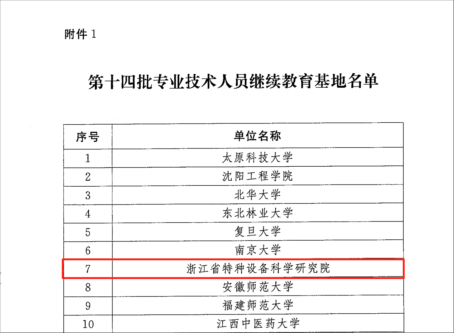 近日,第十四批专业技术人员继续教育基地名单公布。经自愿申报、地方人力资源社会保障厅(局)或行业主管部门推荐、专家评议等程序,共有20个单位获准设立,浙江省特种设备科学研究院位列其中。