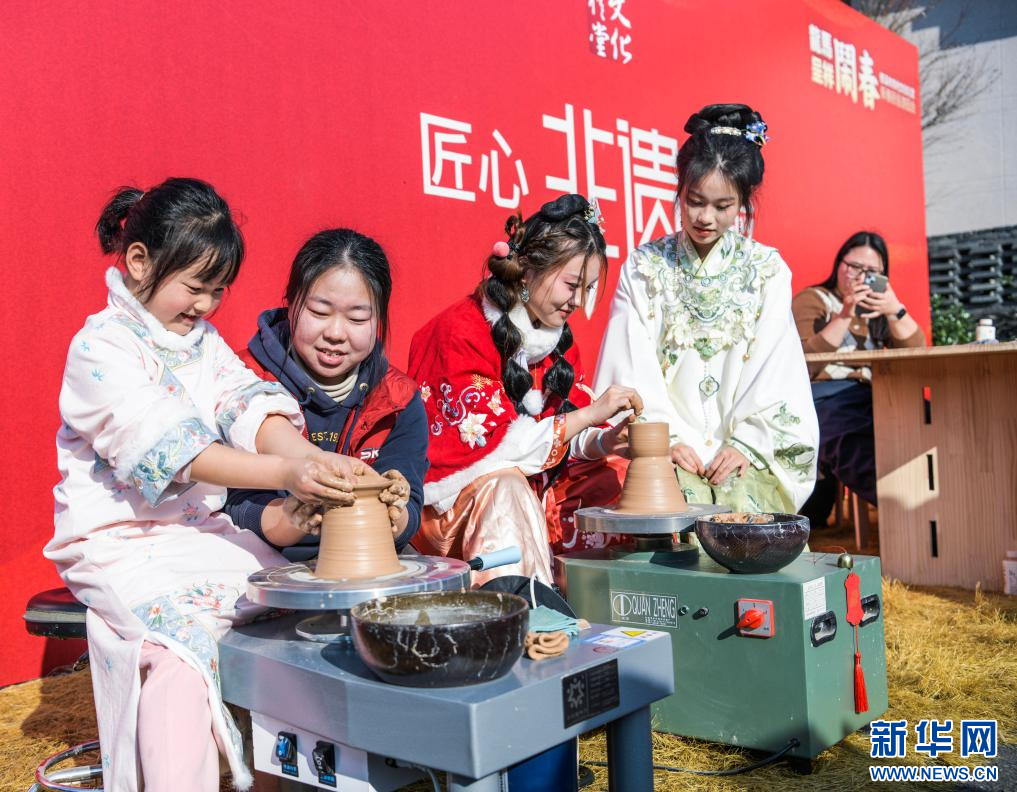12月28日,人们在民俗游园会现场体验传统青瓷制作。