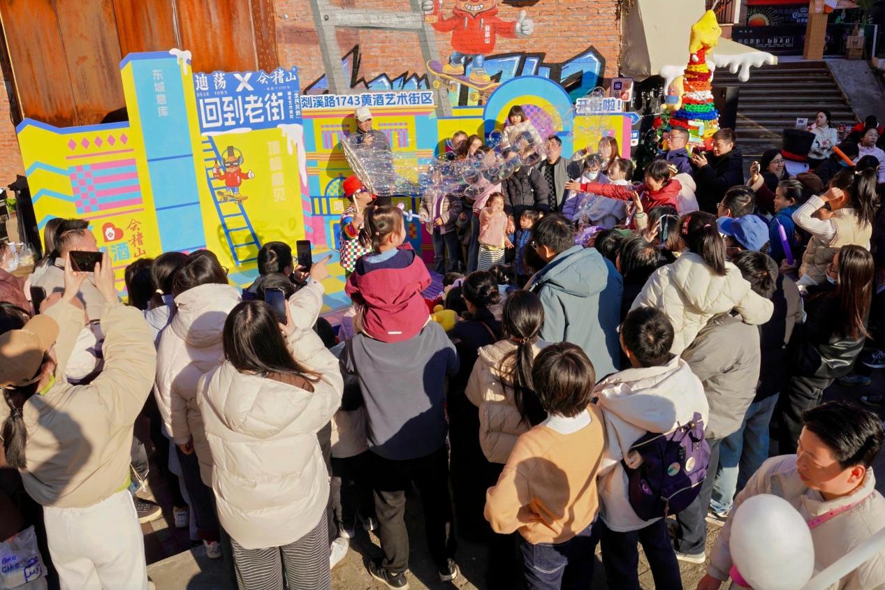 剡溪路全长约630米,曾是城东夜市排档聚集地,后转型为以文创园为核心的青年创业与生活休闲区。本次开街活动以“回到街区!全民共创 暖冬艺术派对”为主题,设置了“顶峰相见”3D涂鸦雪景打卡、全民“梧桐毛衣”编织、青年艺术涂鸦、露天剧场演艺、后备箱集市与跳蚤市场等多元板块,吸引了众多市民、高校学生及家庭参与。