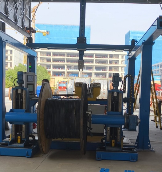 走进这个占地数千平方米的线缆存放和分切专区,往日里施工人员、仓库管理人员出入库、分盘、分切的忙碌场景已然焕新:看不见工人来回奔波搬运线缆的身影,也听不到卷尺拉扯的嘈杂声,取而代之的是2台蓝色新型线缆分盘分切设备有条不紊地作业。机械臂精准抓起一根卷重达数百公斤的电缆,稳稳放置在分盘工位;智能传感器快速扫描线缆规格,将数据实时传输至控制系统;锋利的分切刀具按预设长度精准下刀,切口平整光滑无一丝毛刺;分切后的线缆则自动缠绕成规整小盘。