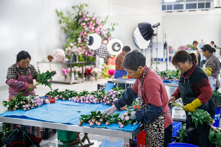 2025年4月,杭坪镇乌浆村鲜花基地内,工人们正在分拣打包鲜切花。(受访者供图)