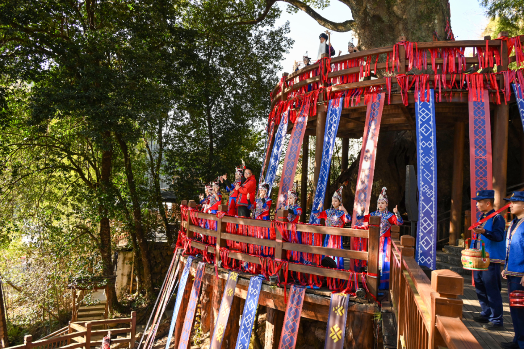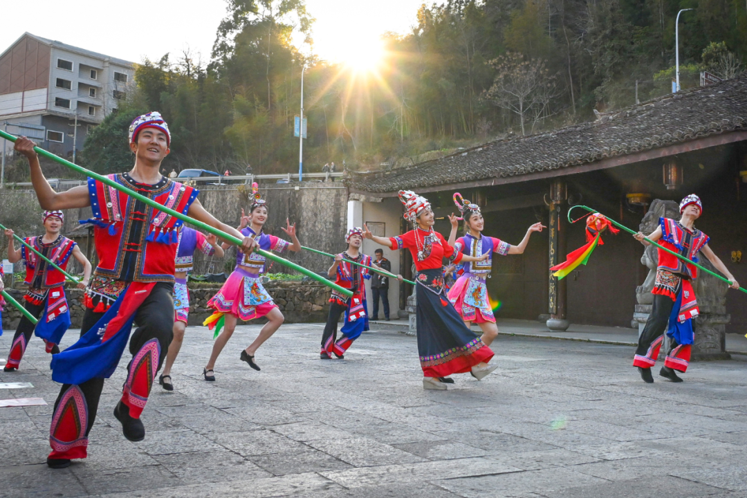 踏入让川民族村,浓郁的畲族风情便扑面而来。村口,身着传统服饰的畲族姑娘端起拦门酒,唱响迎宾山歌。沿着古道前行,大宗祠前,竹竿舞节奏明快,游客跟着起舞,感受畲族歌舞魅力;凤凰古樟下,祈福长老带领游客系上心愿丝带寄托美好期许;凤亭池边,“山歌仙子”与游客对唱互动;小平台上,畲家阿妹彩带飞舞间传递畲家情。