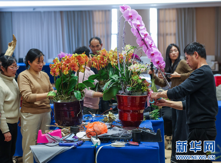 1月8日,澧浦花木城的商户在学习蝴蝶兰插花组盆技巧。