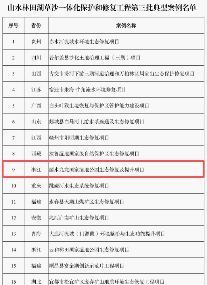 近日,财政部办公厅、自然资源部办公厅、生态环境部办公厅公布了山水林田湖草沙一体化保护和修复工程第三批典型案例,丽水九龙国家湿地公园生态修复及提升项目入选。