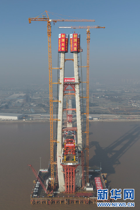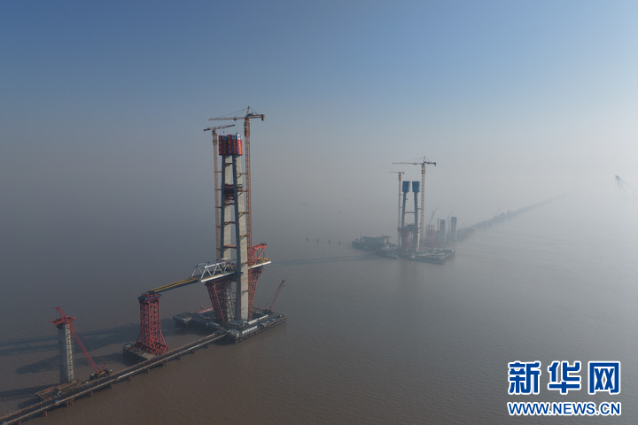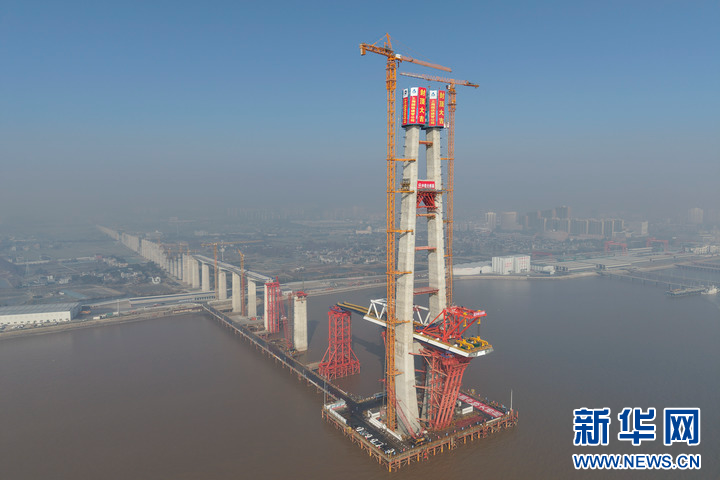 1月16日拍摄的杭州湾跨海铁路桥北航道桥8号主塔(无人机照片)。