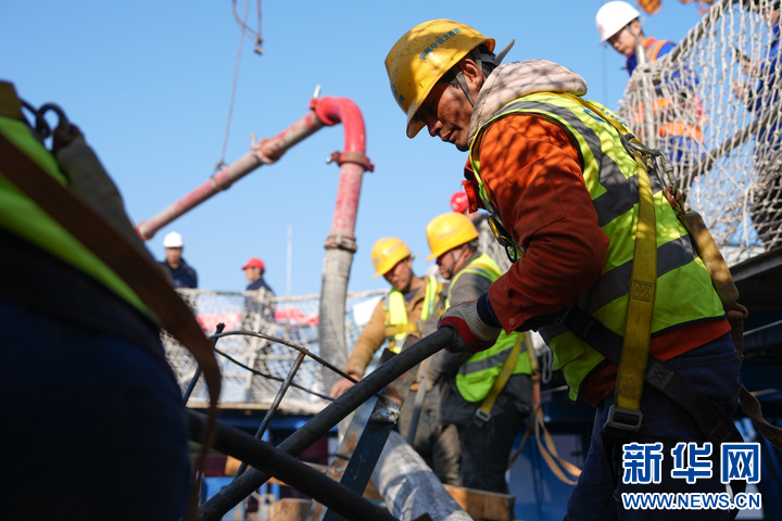 1月16日,中铁大桥局建设者在杭州湾跨海铁路桥北航道桥8号主塔封顶施工现场作业。
