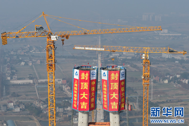 1月16日拍摄的杭州湾跨海铁路桥北航道桥,左侧为实现封顶的8号主塔(无人机照片)。