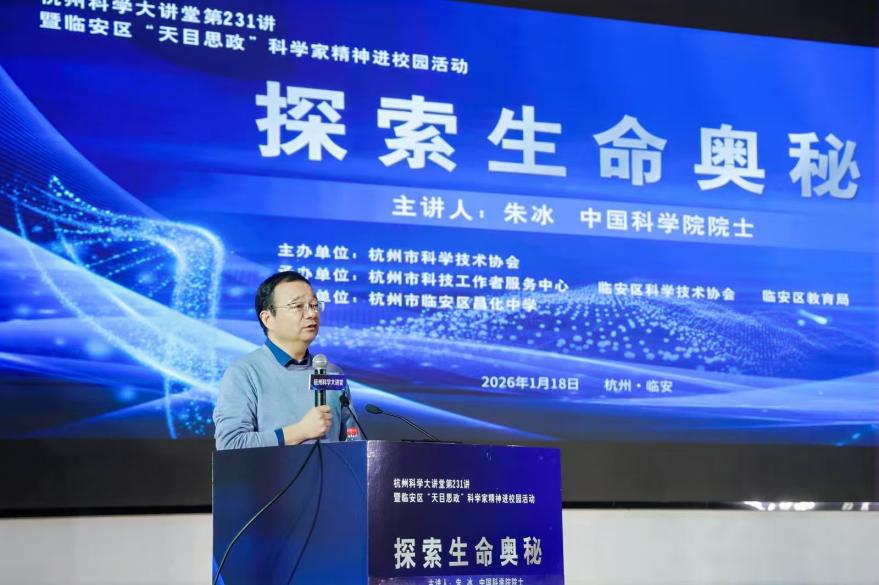 1月18日,杭州科学大讲堂第231讲暨临安区“天目思政”科学家精神进校园活动在浙江省杭州市临安区昌化中学举行。中国科学院院士、中国科学院生物物理研究所副所长朱冰作《探索生命的奥秘》专题报告,近1500名师生以及有关科研人员到场聆听,近17万人次线上参与。