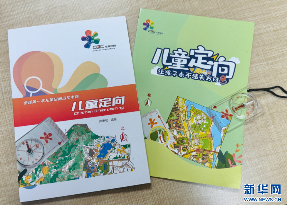 郭申初制作的儿童定向运动读本和指南针。新华网 张欣怡摄