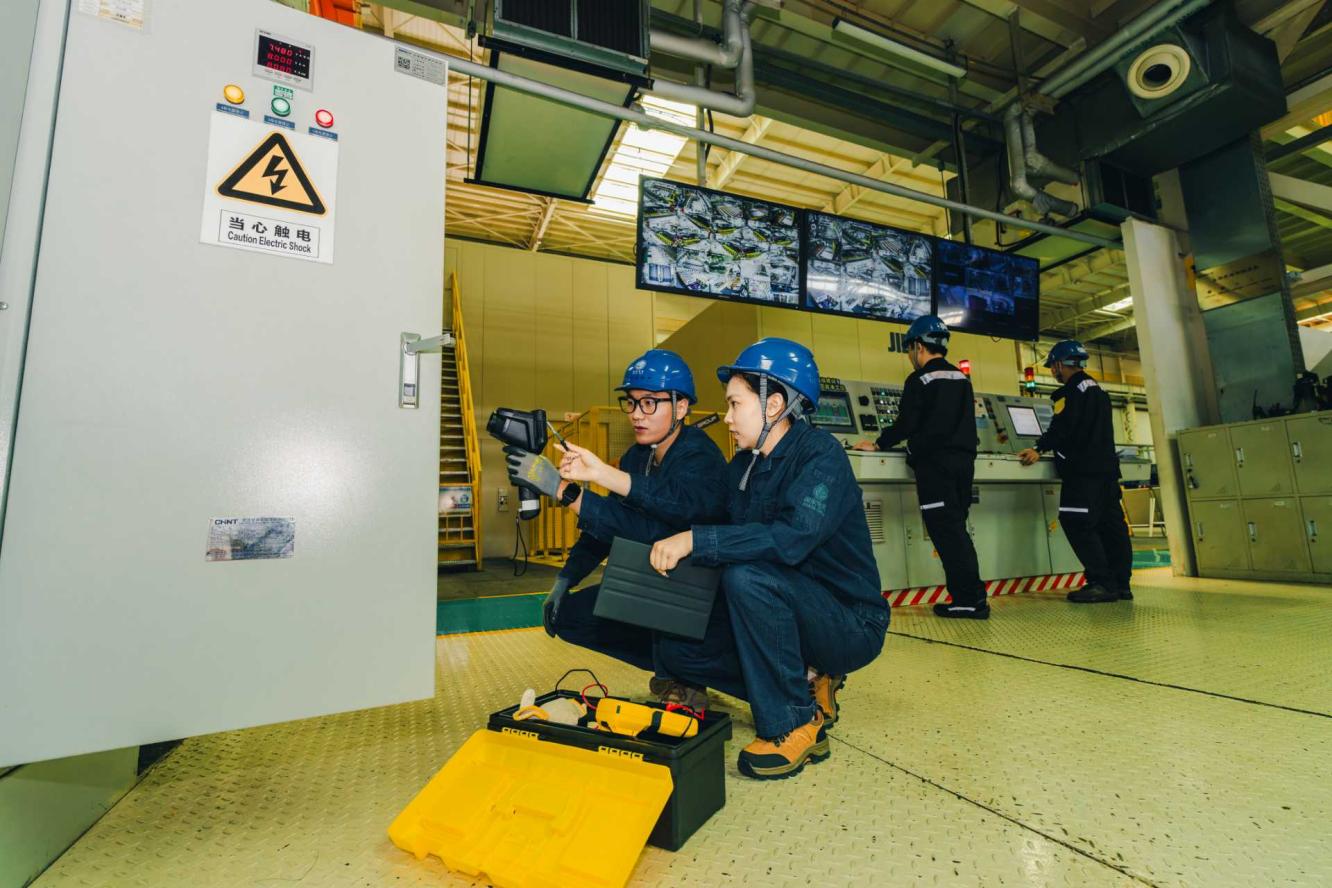 国网浙江电力员工到吉利汽车钱塘制造基地进行用电安全检查,了解企业生产用电状况和用电需求,为企业生产提供稳定电力保障。丁豪 摄