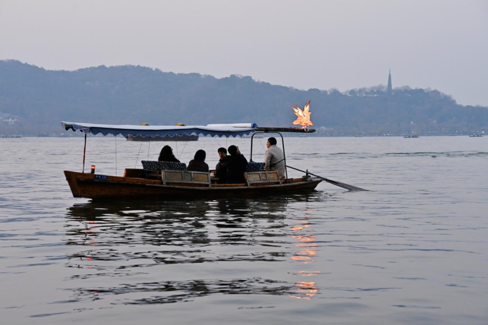 1月23日,装饰着马年彩灯的游船行驶在西湖水面上。新华社记者 江汉 摄