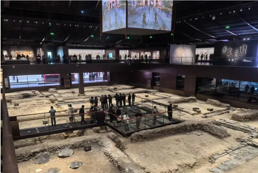 步入场馆,千年遗址的厚重与精妙扑面而来。南馆及中馆一层,衣锦城南城门、125米长的砖砌主排水渠、院落门址等遗迹清晰可见,玻璃栈道下的夯土墙芯、青砖包边城墙遗址,勾勒出古城池的南部轮廓;吴越国和元代的三口古井至今水质清冽,炉灶、陶缸等遗迹则还原了宋元时期官营酒库、醋库的酿造场景,与南宋《咸淳临安志》记载相互印证,尽显当时的市井繁华。中馆二层的“衣锦遗韵”“筑城兴邦”“吴越风华”三个单元,全面梳理了衣锦城的营建历史,其“一门三道”的王城规制、“城陵一体”的独特格局,不仅展现了吴越国高超的营城技艺,更印证了衣锦城作为吴越国境内城池营建范式,对杭州、苏州等江南城市发展的深远影响。