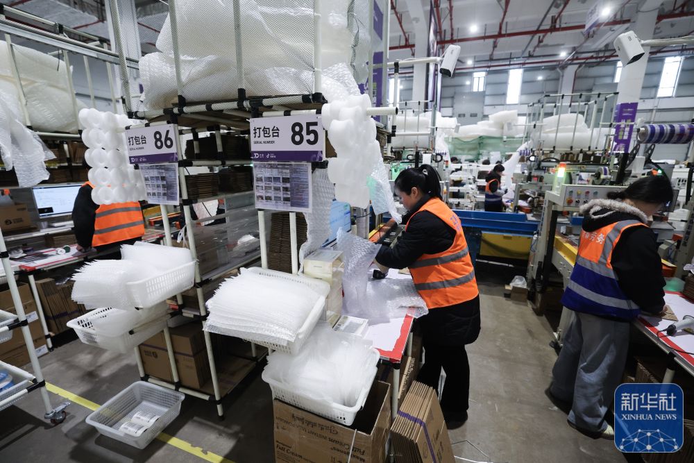 1月30日,义乌综保区跨境电商仓库的工人对完成海关申报的进口商品订单进行打包、张贴快递面单。