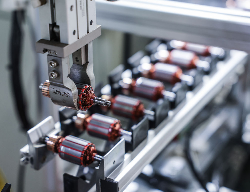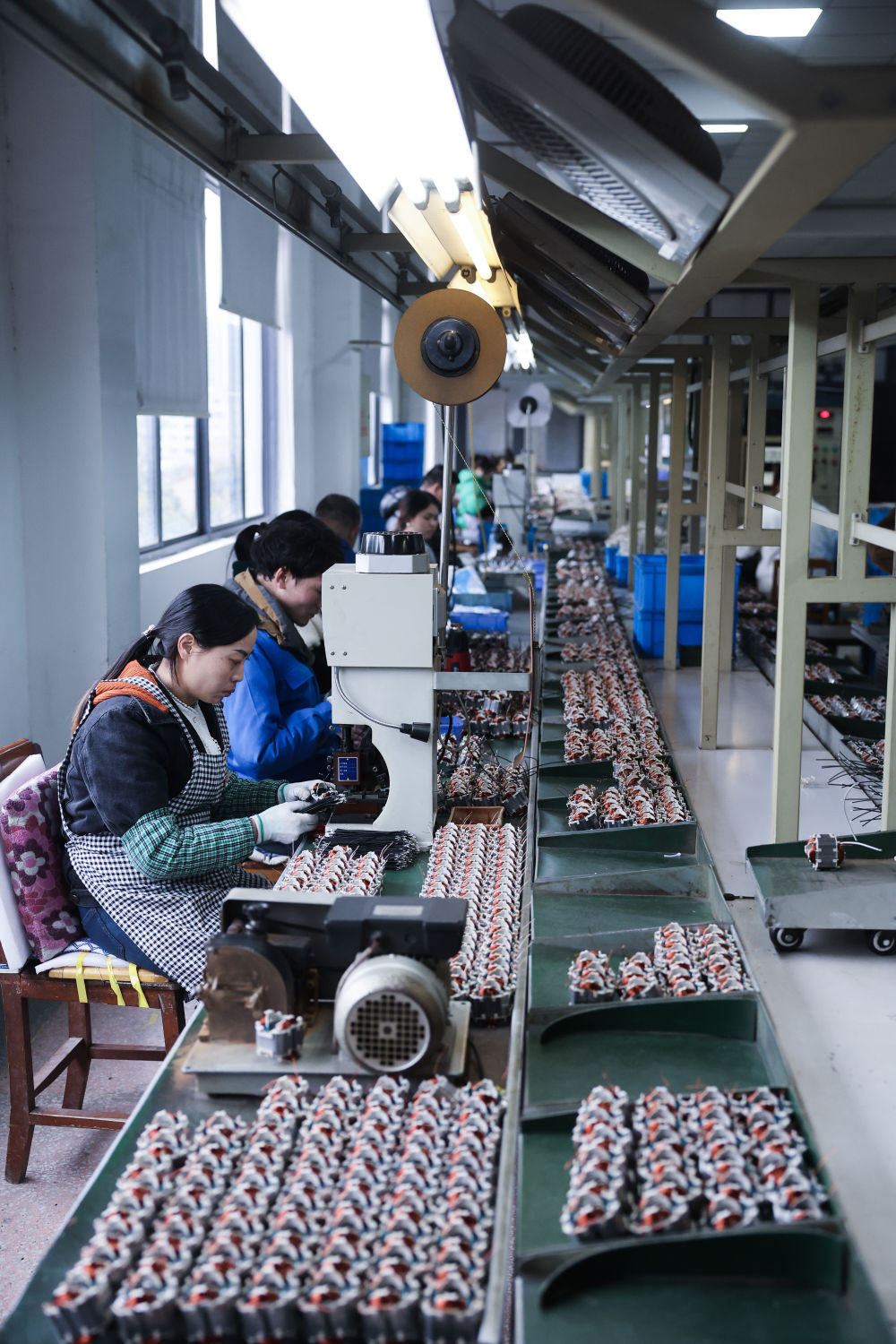 1月29日,在位于金华市金东区的金顺工具有限公司车间内,流水线上在生产电机定子。该公司是一家从事喷枪、喷涂机等喷涂技术与产品研发、制造和销售的国家高新技术企业、国家专精特新“小巨人”企业,产品出口销往欧美97个国家和地区,授权专利197项。