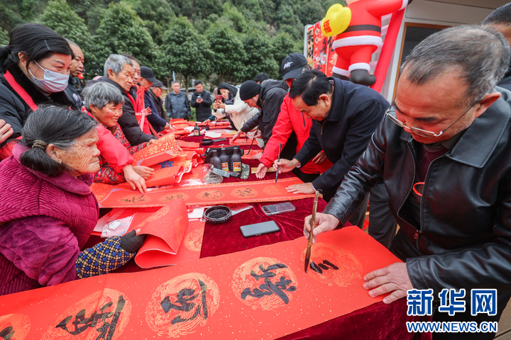 这是2月1日在莲花镇年俗文化活动现场拍摄的写春联送福字活动。
