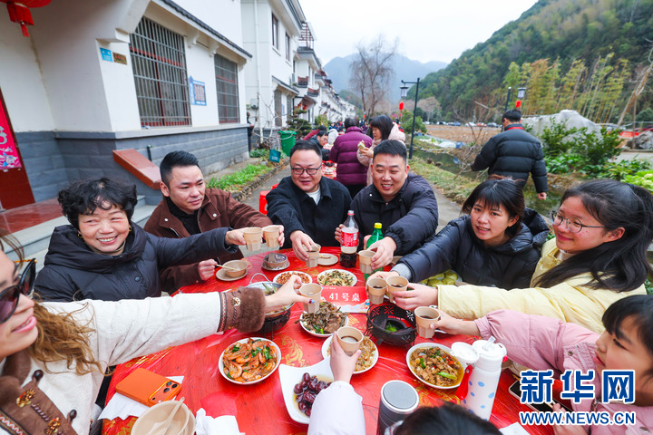 2月1日,当地百姓和游客在莲花镇戴家村品尝百家宴。