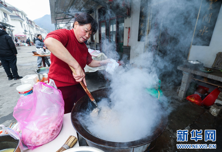 2月1日,莲花镇戴家村村民在为乡村百家宴准备特色美食。