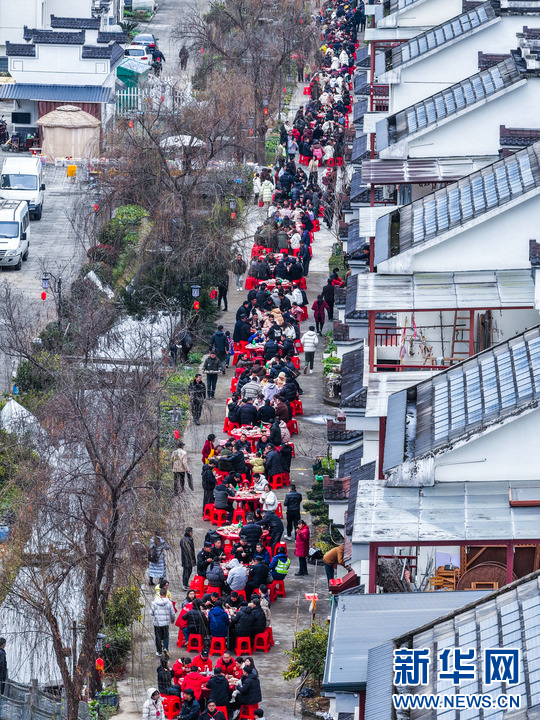2月1日,当地百姓和游客在莲花镇戴家村品尝百家宴(无人机照片)。