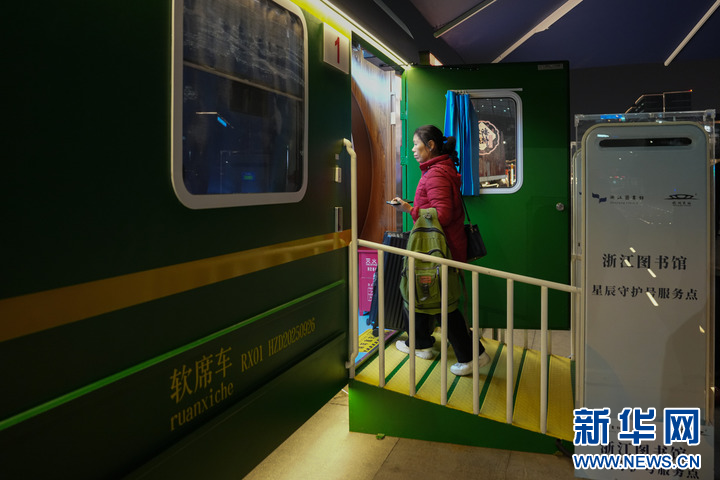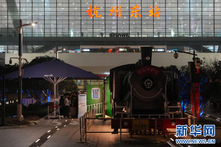 夜幕下的杭州东站东广场,四节复古绿皮车厢亮起暖黄色灯光,成为迎候夜间出行旅客落脚休息的一片“暖心港湾”。