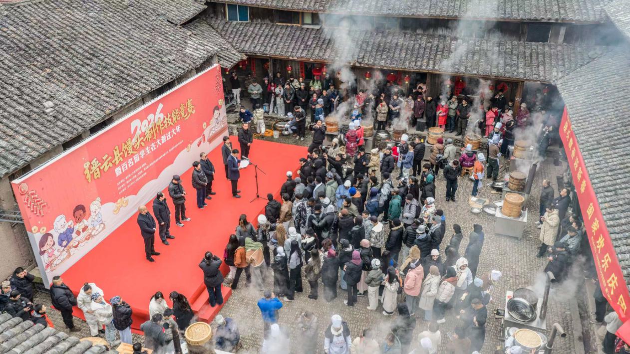 来自浙江农林大学的留学生们围着蒸笼拍照、学着揉面。“缙云是我最爱的地方,每年来都很开心。”