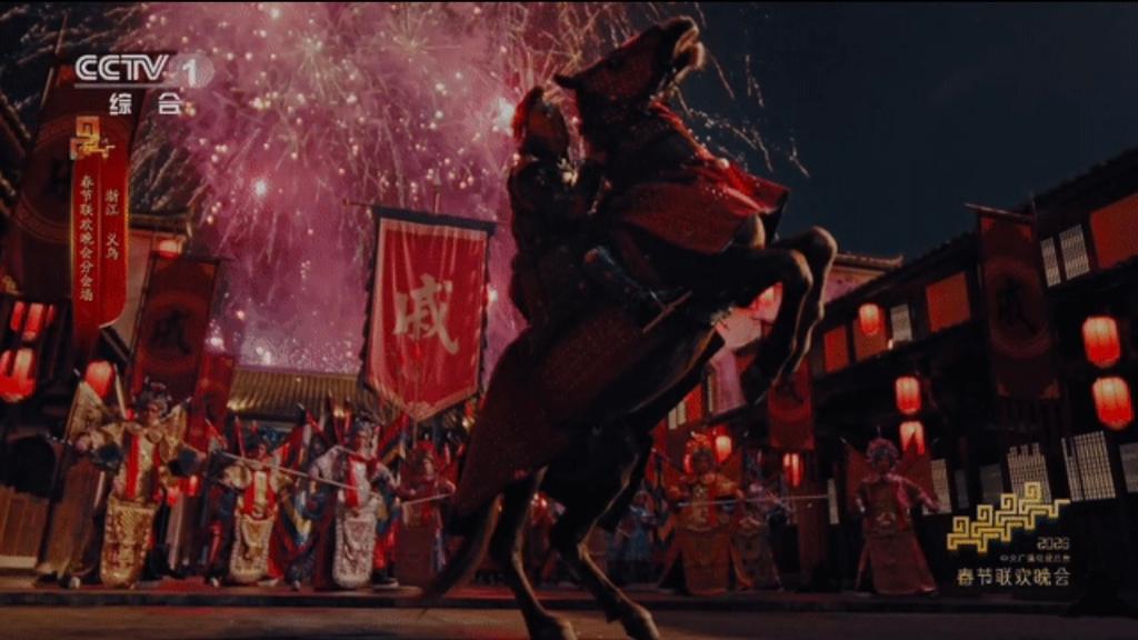 舞台上,宇树机器人扮演起了“黑悟空”,头戴凤翅紫金冠、身穿锁子黄金甲、手持如意金箍棒、驾着“筋斗云”(机器狗)穿梭在义乌市场。