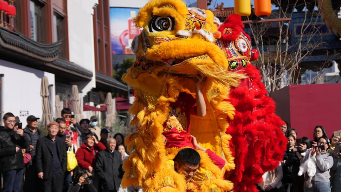 活动伊始,锣鼓声震天响起,舞狮表演率先登场拉开序幕。一红一黄两只醒狮身姿矫健,在锣鼓节拍中腾挪跳跃、甩头摆尾,时而探头试探,时而登高亮相,引得现场阵阵欢呼,不少市民伸手触摸狮毛,期盼沾染新春福气,沉浸式感受非遗民俗的魅力。