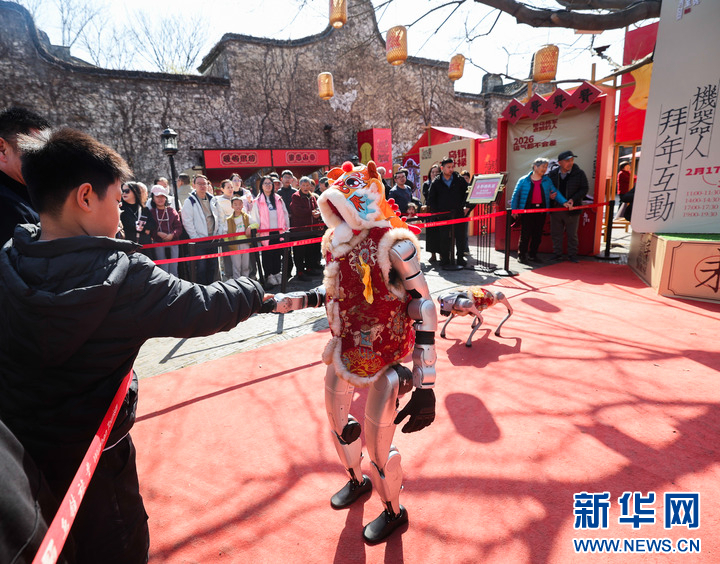 2月21日在乌镇景区内拍摄的机器人拜年表演。