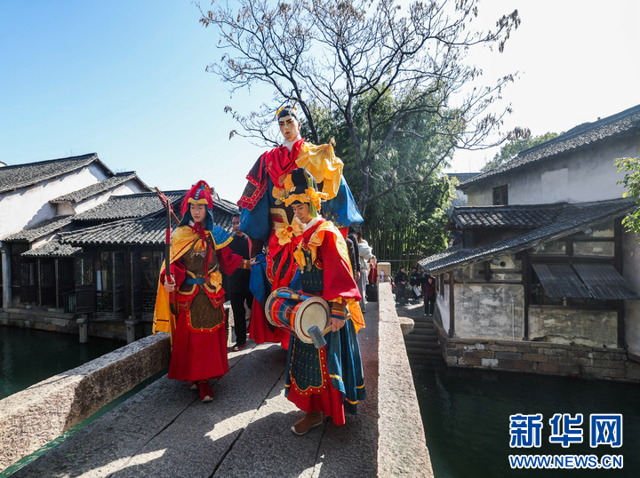 2月21日在乌镇景区内拍摄的高跷巡游表演。
