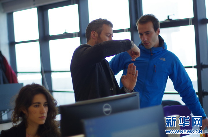 2025年5月,在斐络工业设计公司,两名意大利外籍员工在讨论电动滑板车内部结构细节,一名同事在做电脑三维手绘。受访者供图