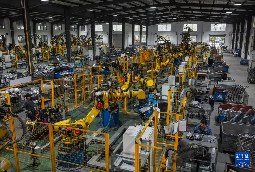2月27日,在位于金华市金东区的金华至信科技有限公司车间里,工业机器人在生产新能源汽车零部件。