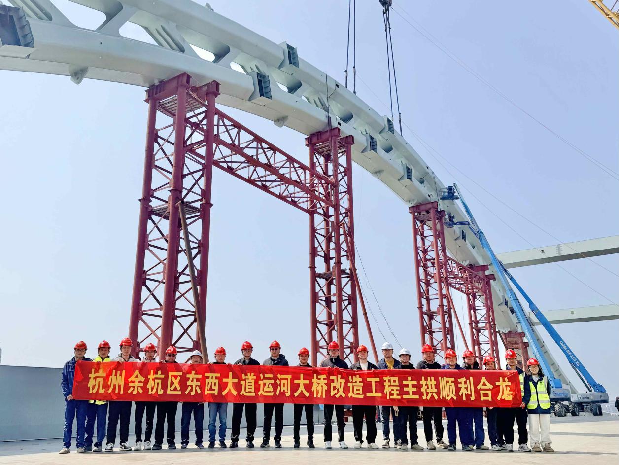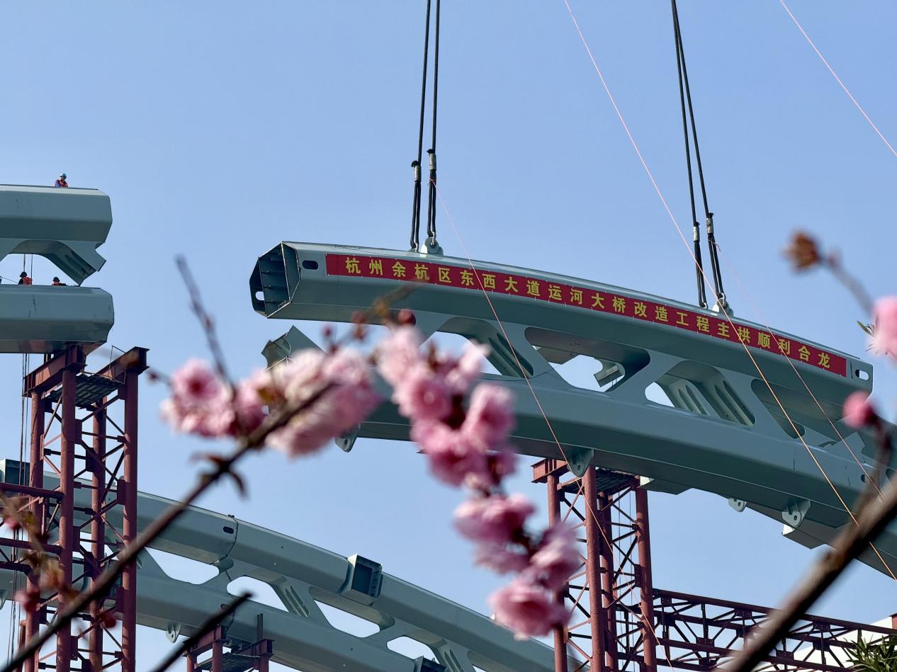 3月14日,随着最后一节拱肋构件在高空稳稳落位,浙江杭州余杭区东西大道运河大桥改造工程(简称“运河大桥项目”)主拱实现毫米级精准合龙。