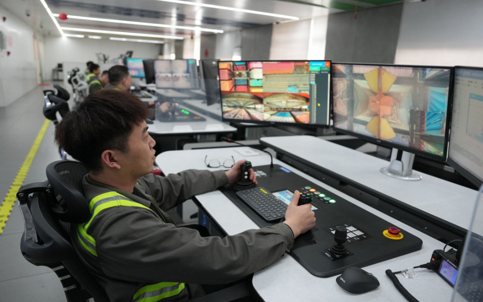 3月29日,龙门吊司机在宁波舟山港北仑第三集装箱码头有限公司远程控制中心作业。