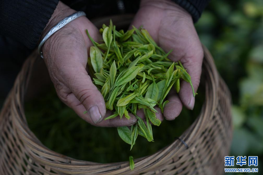 4月8日,采茶工在浙江省安吉县溪龙乡黄杜村茶园展示采摘的白茶青叶。